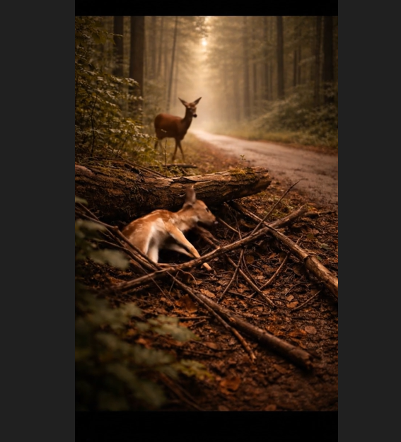 Fog drifted between tall trees, and sunlight broke softly through the leaves. Near the edge of a narrow forest road, a small fawn lay trapped beneath a fallen tree and tangled branches.